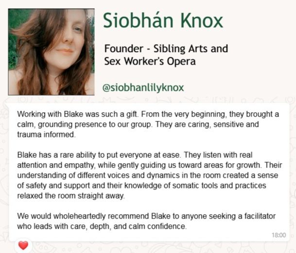 SIGN ME UP"I've worked with a lot of therapists over the years and Blake has an exceptional therapeutic capacity. In the sessions I've had with them I've felt so solidly yet effortlessly held by their lively and interested energy. And their attunement to me and capacity to intuit what might be helpful has meant that each session has been a really significant step forward for me. I can't recommend them highly enough."