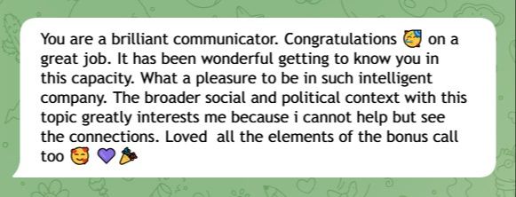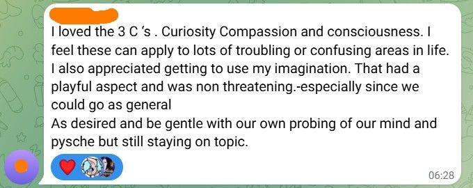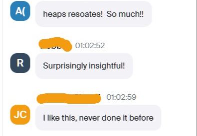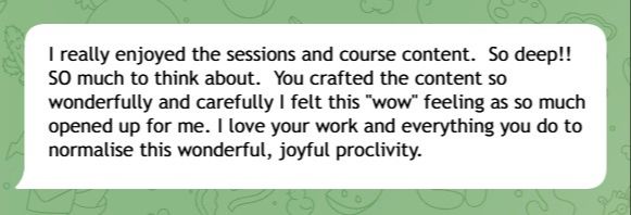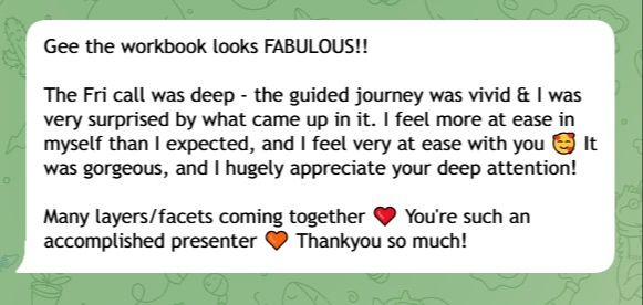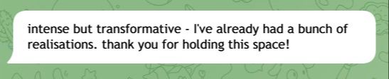 We're building a community, so your participation is warmly encouraged, but you're welcome to use a pseudonym, and/or keep your camera turned off if you prefer not to show your face during calls. Calls will be recorded so people can catch up on the replay if they can't make it live, but the replays will only be shared privately within the group. You are welcome to talk about your own experiences of the group outside it, but I ask that you respect confidentiality and refrain from sharing others' stories.